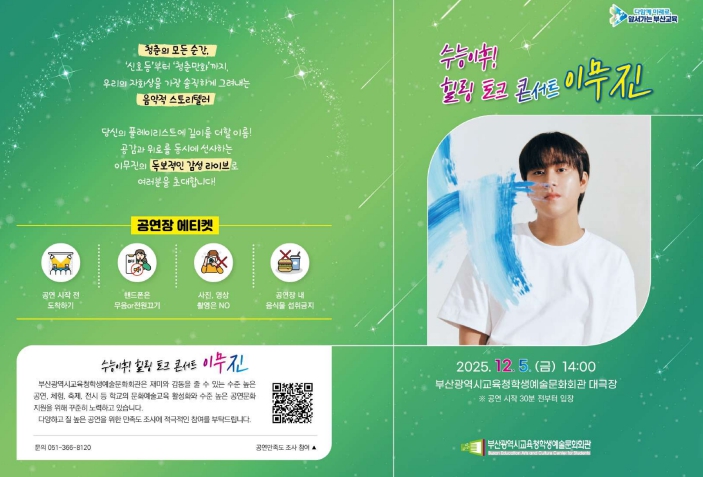 [뉴스다컴] 부산광역시교육청학생예술문화회관(관장 박은혜)은 오는 5일 오후 2시 학생예술문화회관 대극장에서 수능을 마친 고3 학생 700여 명을 대상으로 가수 이무진과 함께하는 ‘수능 이후! 힐링 토크 콘서트’를 개최한다.