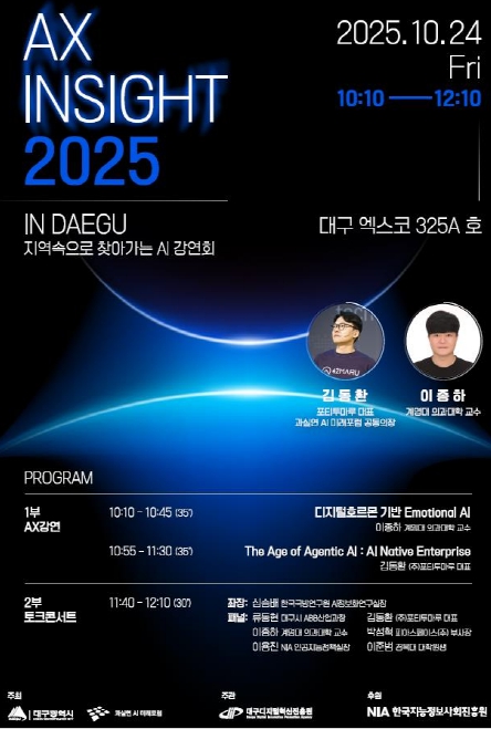 [뉴스다컴] 대구광역시는 (사)과실연 AI미래포럼과 함께 10월 24일(금) 대구 엑스코에서 ‘AX·Security Insight 2025 In Daegu’를 개최한다.