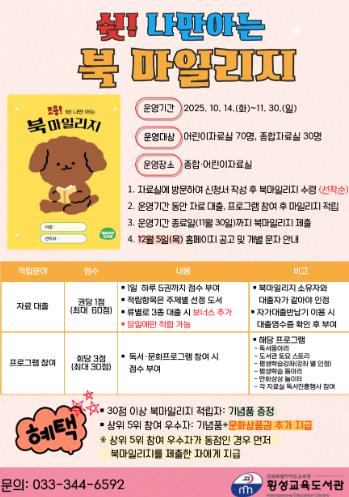 참여 신청은 10월 14일부터 종합자료실 및 어린이자료실에서 선착순으로 북 마일리지를 배부받으면 된다.