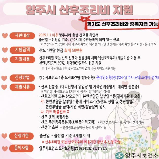 [뉴스다컴] 양주시보건소가 2025년 1월 1일 출생아부터 관내 출산가정을 대상으로 ‘양주시 산후조리비 지원사업’을 시행하고 있다.