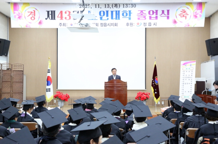 [뉴스다컴] 대한노인회 정읍시지회(지회장 이호춘) 부설 노인대학(학장 김동규)이 지난 13일 지회 2층 강당에서 ‘2025년도 제43기 대한노인회 부설 노인대학 졸업식’을 열었다.