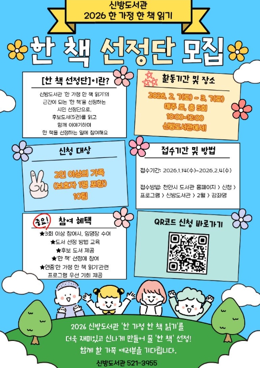 [뉴스다컴] 천안시 신방도서관은 ‘한 책 선정단’ 참여 가족을 모집한다고 20일 밝혔다.