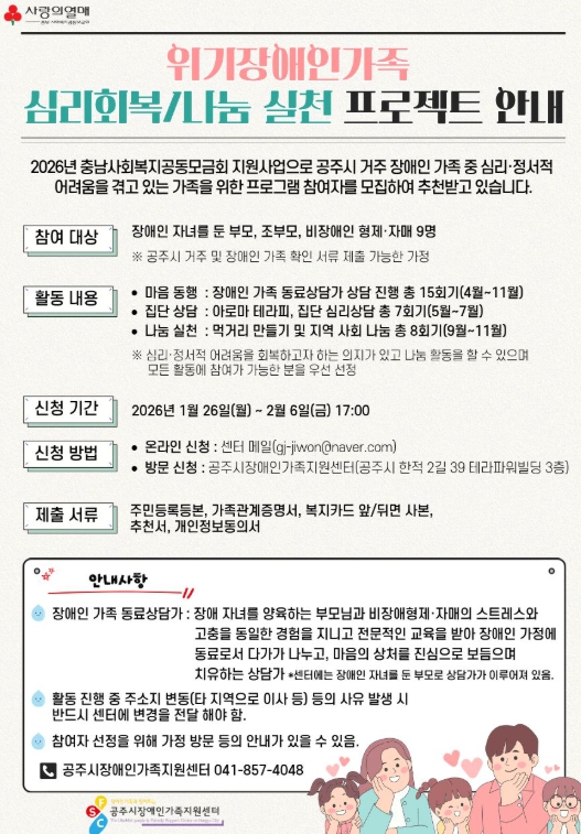 [뉴스다컴] 공주시 장애인가족지원센터는 2026년 충남사회복지공동모금회 지원을 받아 ‘위기 장애인가족 심리회복 및 나눔 실천 프로젝트’ 참여자를 모집한다고 26일 밝혔다.