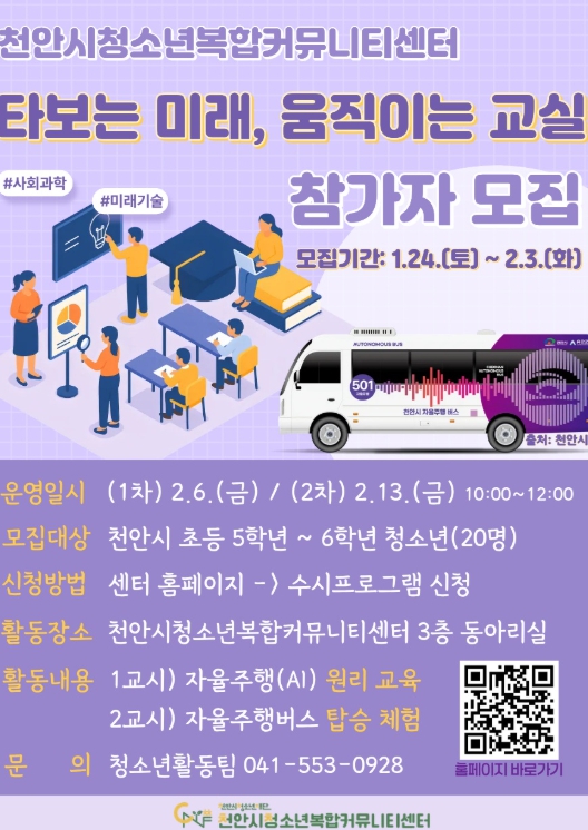 [뉴스다컴] (재)천안시청소년재단 천안시청소년복합커뮤니티센터가 겨울방학을 맞아 자율주행버스를 직접 타보고 미래 기술을 배우는 ‘타보는 미래, 움직이는 교실’ 참가자를 모집한다고 26일 밝혔다.