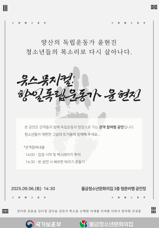 물금청소년문화의집 관계자는 “윤현진 선생의 뜨거운 조국애와 희생정신을 오늘의 청소년들이 무대 위에서 재현하는 뜻깊은 시간”이라며 “역사를 기억하고 계승하는 과정에서 관객들과 함께하는 참여형 공연으로 그 의미를 더했다”고 밝혔다.