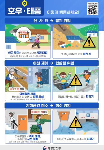 주요 행동요령으로는 ▲붕괴 위험이 있는 지역 주민은 사전 대피 ▲산사태 우려지역·급경사지 접근 금지 ▲물에 잠긴 도로 통행 시 발밑 유의 ▲지하차도 및 침수우려 도로 진입 금지 등이 있다.