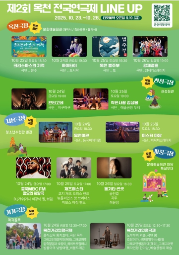 올해 연극제는 작품 공모로 선정한 5편, 초청 및 지역 작품 4편, 인형극 8편과 축하 공연 등 풍성한 공연으로 관객에게 웃음과 감동을 선사할 예정이다. 특히, 작품 공모에는 전국 58개 극단이 참여해 11대 1의 높은 경쟁률을 기록하며 옥천 전국연극제가 한국 연극의 대표 축제로 자리 잡았음을 확인시켰다.