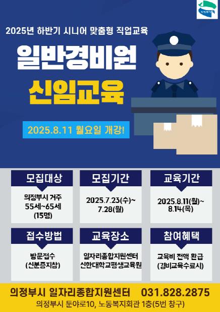 [뉴스다컴] 의정부시는 관내 시니어 세대의 재취업을 지원하고 안정적인 일자리를 연계하기 위해 ‘일반경비원 신임교육’ 참여자를 모집한다.