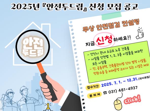 자세한 내용과 신청방법은 안산도시공사 누리집(홈페이지)에 접속해 ‘공지사항’ 게시판에서 관련 게시물을 확인하면 되며, 관련 문의는 안전점검 담당자에게 하면 된다.