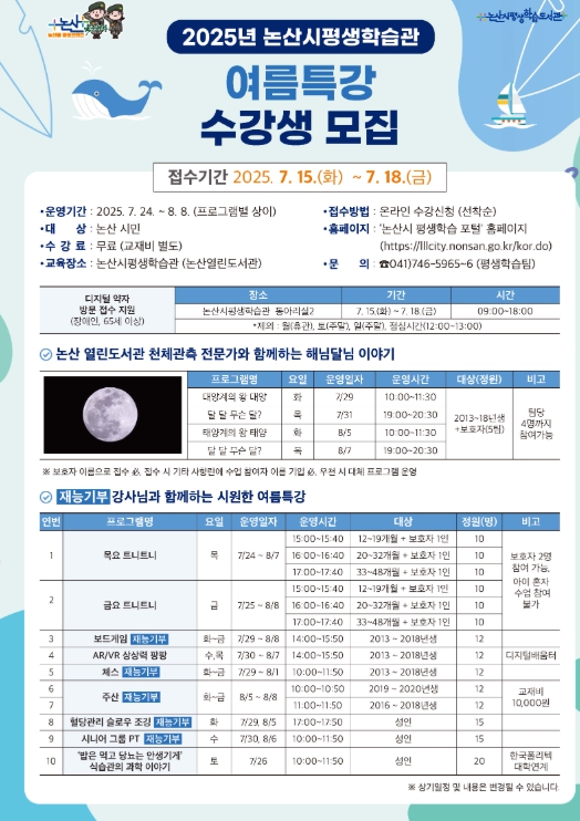 [뉴스다컴] 논산시가 오는 7월 15일부터 2025년 논산시평생학습관 여름특강과 ‘소중한사람들(장애인)’ 평생학습도시 운영 프로그램의 수강생을 모집한다.