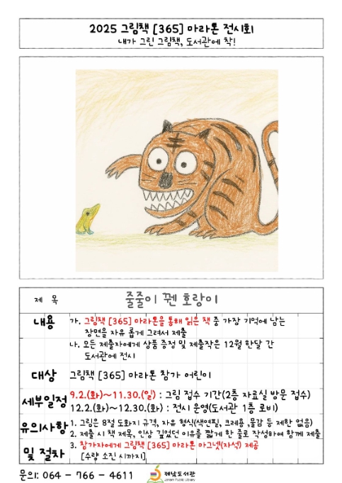 [뉴스다컴] 제주도교육청 제남도서관은 오는 11월 30일까지 ‘2025 그림책 365 마라톤–내가 그린 그림책, 도서관에 착!’ 전시회 참가 작품 신청을 받는다.