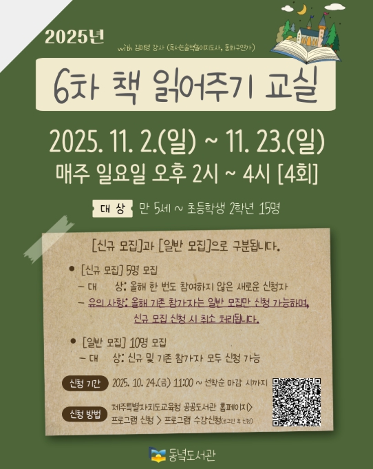 [뉴스다컴] 제주도교육청 동녘도서관은 11월 2일부터 23일까지 평생교육실에서 ‘2025년 제6차 책 읽어주기 교실’을 운영한다.