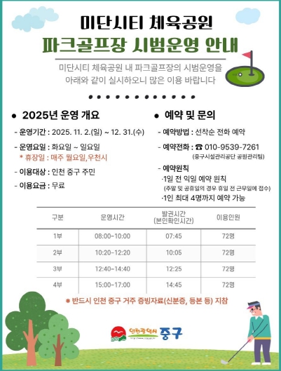 [뉴스다컴] 인천시 중구는 미단시티 체육공원 내에 ‘파크골프장’을 새로 조성하고, 오는 11월 2일부터 시범운영에 들어간다고 밝혔다.