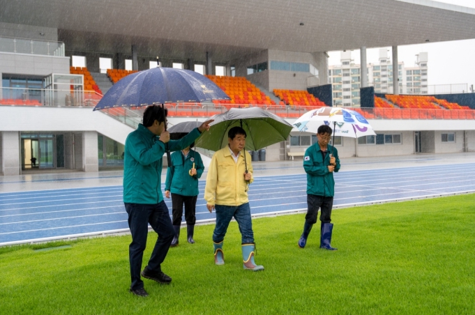 ▲ 이재영 증평군수 호우 대비 종합운동장 현장 점검 |