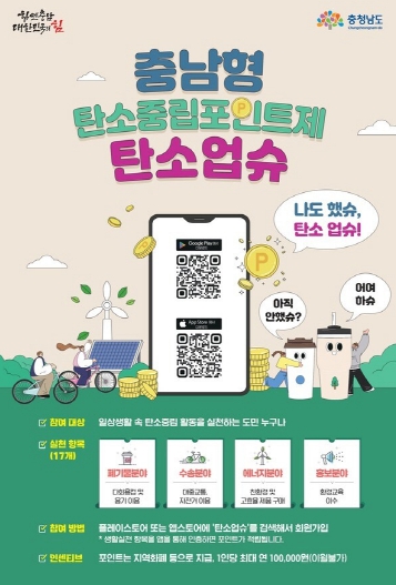 ‘탄소업슈’는 충청남도 전역에서 탄소중립 달성을 위해 추진하는 제도로, 폐기물·수송·에너지·홍보 등 4개 분야 17개 항목으로 운영되고 있다.