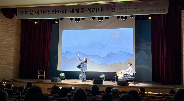 [뉴스다컴] 세종특별자치시교육청은 12월 23일에 2층 대강당에서 학생과 학부모, 교직원 등 세종 교육공동체를 대상으로 ‘2025년 우리동네 예술학교 예술명사 초청프로그램 소리꾼 이자람: 판소리, 세계를 울리다’를 성황리에 마쳤다.