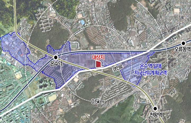 대상지는 1·7호선 온수역에서 도보 10분 거리에 위치하며, 간선도로인 경인로와 인접해 교통 접근성이 우수하다. 주변에서 다양한 개발사업이 진행 중으로, 향후 쾌적한 주거환경이 조성될 것으로 기대되는 지역이다.