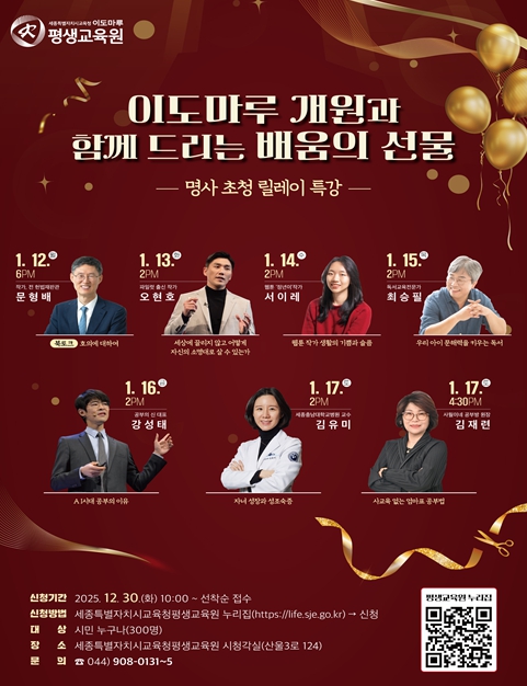 [뉴스다컴] 세종특별자치시교육청평생교육원(원장 송정순)은 2026년 1월 개원을 기념해 1월 12일부터 17일까지 6일간 개원 주간을 운영하고, 개원 행사의 일환으로 ‘명사 초청 릴레이 특강’을 매일 개최한다.