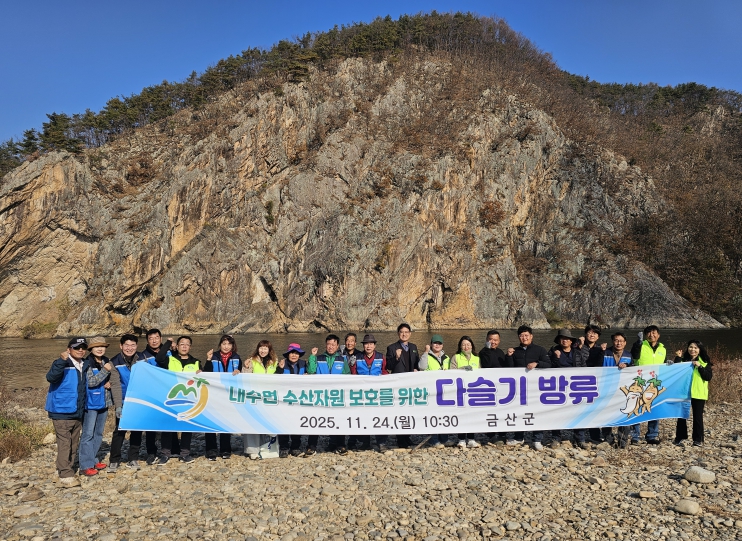[뉴스다컴] 금산군은 지난 24일 부리면 적벽강 일원에서 지역 하천 생태계 복원과 수질 개선을 위해 약 300만 패의 다슬기를 방류했다.