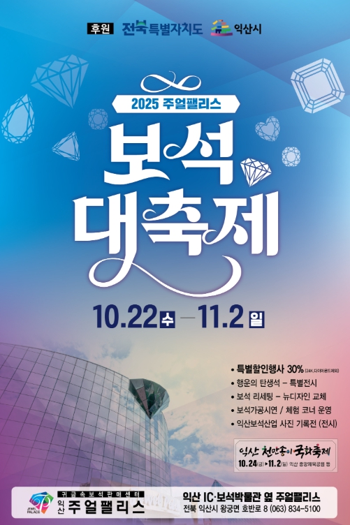 익산시 관계자는 "주얼팰리스 보석대축제는 익산이 지닌 보석산업의 경쟁력과 가치를 동시에 알리는 자리"라며 "가을 정취 속에서 시민과 관광객 모두가 반짝이는 추억을 만들길 바란다"고 전했다.