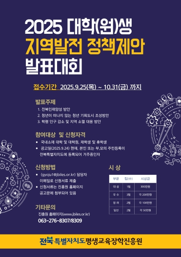 [뉴스다컴] 전북특별자치도평생교육장학진흥원은 지역 발전에 대한 청년들의 관심과 참여를 높이기 위해 '2025년 대학(원)생 지역발전 정책제안 발표대회'를 개최한다고 24일 밝혔다.