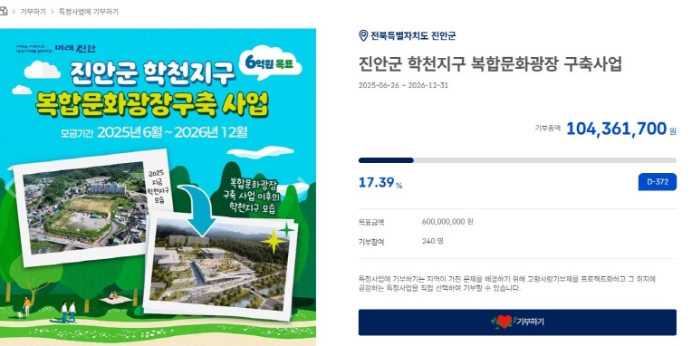 [뉴스다컴] 진안군이 고향사랑기부제 지정기부사업으로 지난 6월부터 추진 중인 “학천지구 복합문화광장 구축사업”이 모금 시작 6개월 만에 누적 모금액 1억 원을 달성했다.