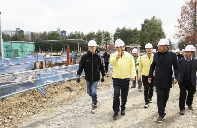 | ▲ 최대호 안양시장이 26일 청계통합정수장 고도정수처리시설 공사 현장을 방문해 진행상황을 점검하고 관계자들을 격려했다 |