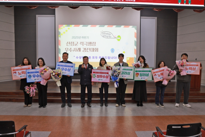 [뉴스다컴] 산청군은 지난 23일 2025년 하반기 적극행정 경진대회에서 1차 사전심사와 2차 대국민 온라인투표, 최종 적극행정위원회 심사를 거쳐 총 8건의 우수사례(최우수 1건, 우수 2건, 장려 2건, 노력 3건)를 선정했다고 밝혔다.