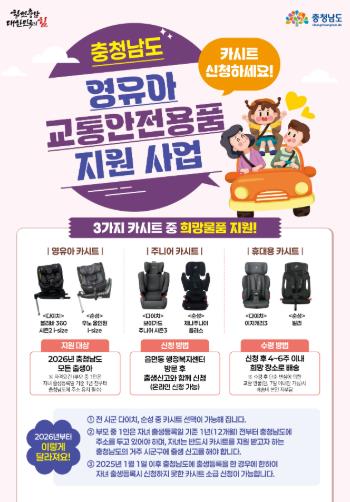 기존에는 당해연도 관내에 출생신고를 한 신생아를 대상으로 영유아, 주니어, 휴대용 카시트 중 선택한 1개를 지원했으나, 올해부터는 충남도 내 거주요건 강화 및 카시트 제조사를 선택할 수 있도록 바뀌었다.