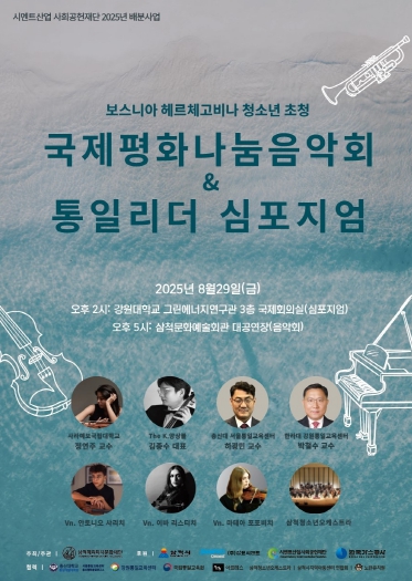 [뉴스다컴] (재)삼척헤리티지문화재단(이사장 심태은)은 오는 8월 29일 삼척문화예술회관 대공연장과 강원대학교 국제회의실에서 공존과 통일의 가치를 나누기 위해 '보스니아 헤르체고비나 청소년 초청 국제평화나눔 음악회 & 통일리더 심포지엄'을 개최한다.
