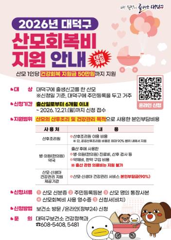 대덕구보건소 관계자는 “출산 이후 산모의 회복은 가정의 안정과 직결되는 중요한 문제”라며 “산모회복비 지원이 산후조리와 건강관리에 드는 실질적인 비용 부담을 줄이고, 나아가 아이 키우기 좋은 대덕구를 만드는 데 도움이 되길 바란다”고 말했다.