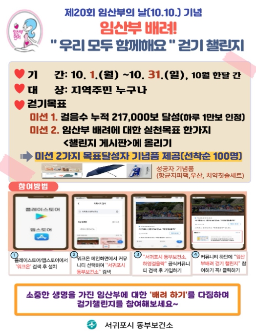 [뉴스다컴] 서귀포시 동부보건소는 오는 10월 10일 제20회 임산부의 날을 맞아 임신·출산에 대한 긍정적 인식 고취 및 임산부가 배려 받는 사회 분위기 조성을 위해 ‘임산부 배려 걷기 챌린지’를 실시한다고 밝혔다.
