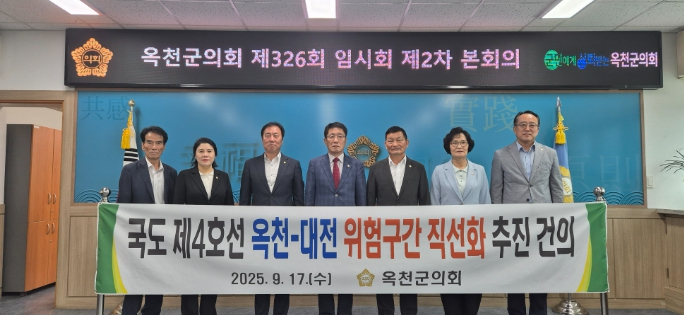 [뉴스다컴] 옥천군의회(의장 추복성)는 9월 17일 제326회 임시회 제2차 본회의에서 '국도4호선 옥천~대전 위험구간 직선화 조속 추진 촉구 건의안'을 만장일치로 채택했다.