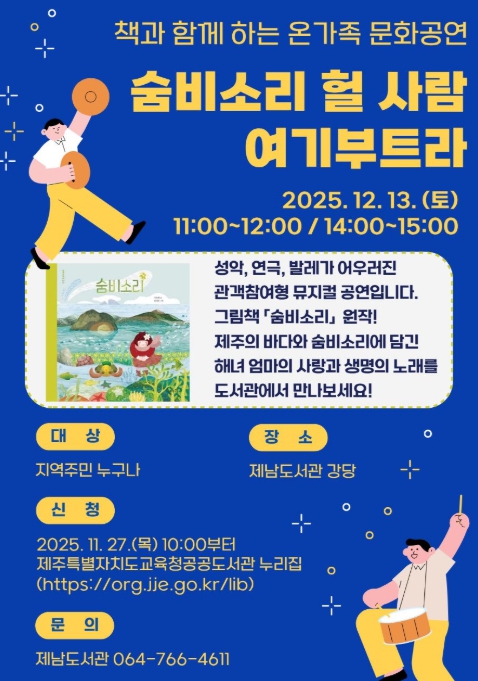 [뉴스다컴] 제주도교육청 제남도서관은 12월 13일 오전 11시와 오후 2시 두 차례 유아·초등학생과 보호자, 지역주민 200명을 대상으로 책과 함께 하는 온가족 문화공연 ‘숨비소리 헐 사람 여기부트라’를 운영한다.