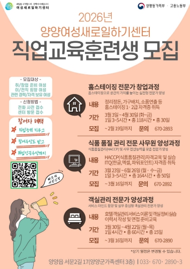 [뉴스다컴] 양양여성새로일하기센터는 취·창업을 희망하는 여성을 대상으로 2026년도 직업교육훈련생 50명을 모집한다.