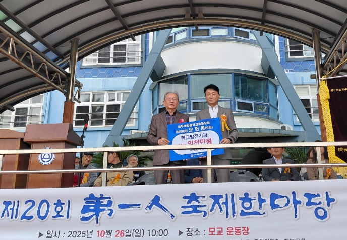 [뉴스다컴] 제주도교육청 제주제일중학교는 26일 열린 제20회 제주제일중학교 총동문회‘제일인(弟一人) 축제 한마당’에서 제8회 졸업생 오헌봉 ㈜유성건설 회장이 학교 발전을 위해 2025년부터 2027년까지 3년간 매년 1천만 원씩, 총 3천만 원의 발전기금을 기탁하기로 하고 첫 해분 1천만 원을 전달했다고 밝혔다.