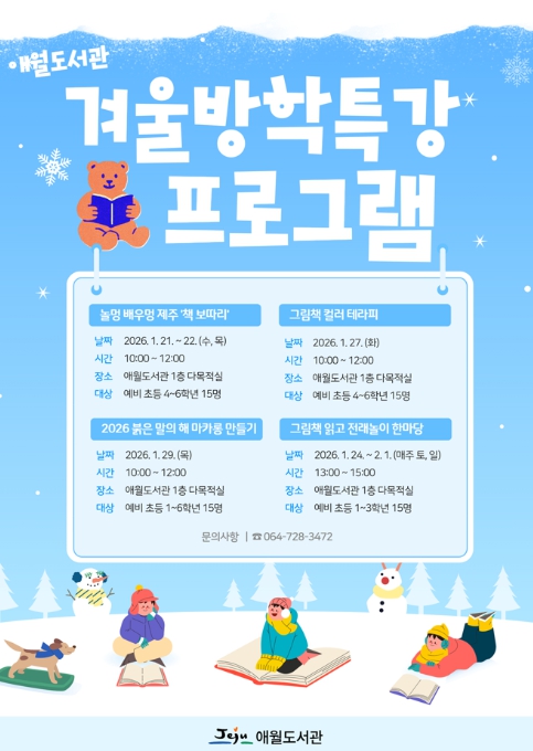[뉴스다컴] 제주시 애월도서관은 겨울방학을 맞아 어린이들이 책과 놀이, 체험 활동을 통해 즐겁게 배우고 독서에 대한 흥미와 창의력을 키울 수 있도록 ‘2026 애월도서관 겨울방학특강 프로그램’을 운영한다.