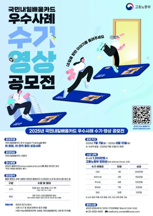[뉴스다컴] 고용노동부는 7월 7일부터 8월 10일까지 '2025년 국민내일배움카드 우수사례 수기·영상 공모전'을 개최한다. 참여를 희망하는 국민은 공모전 홈페이지에서 응모할 수 있다.