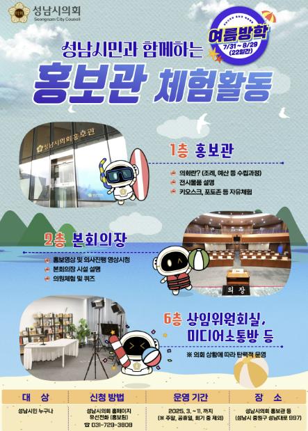 의회 체험활동은 오는 11월까지 회기 기간을 제외한 평일 오전 10시부터 오후 5시까지 운영되며, 의회 일정에 따라 탄력적으로 조정될 수 있다. 참여를 희망하는 청소년 또는 학교는 성남시의회 홈페이지 ‘의회체험활동’ 메뉴에서 신청하거나, 의회사무국 홍보팀으로 유선 문의하면 된다.