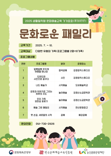 이번 프로그램은 가족 간의 소통과 감수성을 키우는 활동부터 전통 공예 체험, 감정 표현 교육, 사진예술, 창의적 이야기 만들기 등 다양한 주제로 구성되어 있다. 특히 다양한 가족 형태와 생애주기를 고려해 맞춤형으로 설계됐으며, 참여자 모집은 7월부터 각 프로그램 일정에 맞춰 순차적으로 진행될 예정이다.
