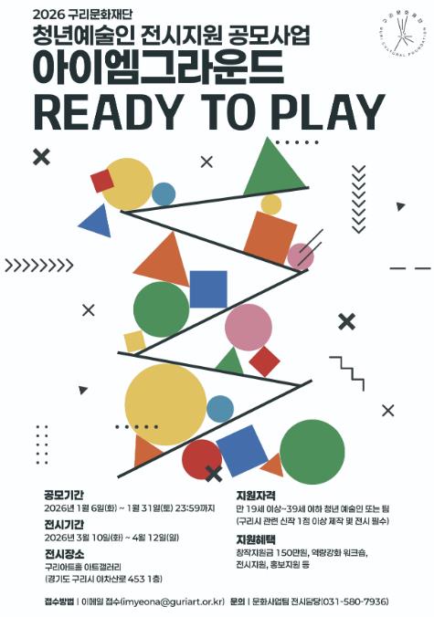 [뉴스다컴] (재)구리문화재단은 청년 예술인의 도약과 성장을 지원하기 위한 청년 정책 플랫폼 사업의 일환으로, 2026년 청년 예술인 전시지원 공모사업 '아이엠 그라운드, Ready to Play'에 참여할 예술인을 1월 6일부터 1월 31일까지 모집한다.