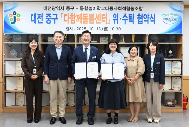 [뉴스다컴] 대전 중구는 13일 통합놀이학교다동 사회적협동조합(대표 이미라)과 다함께돌봄센터 석교1호점 위수탁 운영협약을 체결했다고 밝혔다.