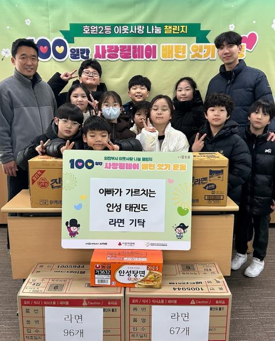 [뉴스다컴] 의정부시 호원2동주민센터는 12월 31일 아빠가 가르치는 인성태권도 수련생들이 정성을 모아 취약계층을 돕기 위한 라면 310개를 기탁했다고 전했다.