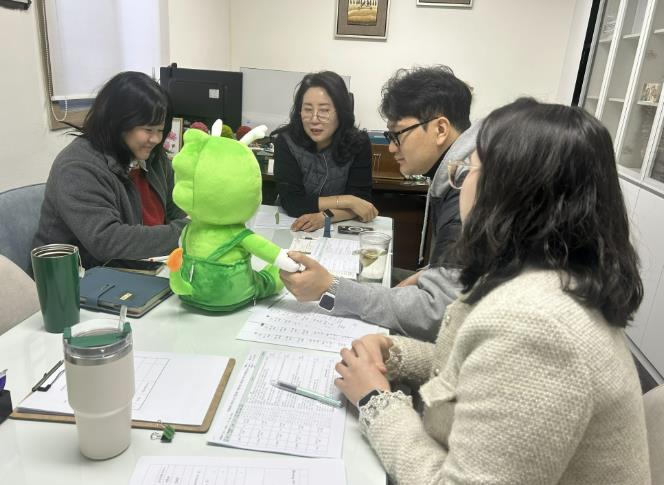 ▲ 충남 계룡시 노인복지관 직원들이 AI 돌봄인형을 활용한 비대면 말동무 서비스 지원사업 회의를 진행하고 있다