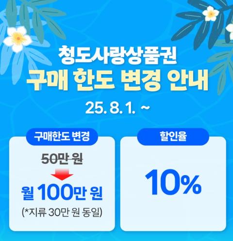 [뉴스다컴] 청도군은 군민들의 소비 여력을 높이고 지역경제 활성화를 위해 오는 8월 1일부터 청도사랑상품권의 월 구매한도를 기존 50만원에서 100만원으로 상향한다고 밝혔다.