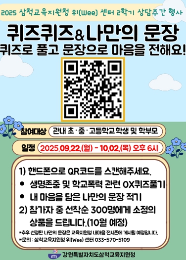 [뉴스다컴] 삼척교육지원청 위(Wee)센터에서는 9월 22일에서 10월 2일까지 진행되는 ‘2학기 상담주간’을 맞아, 학생 참여형 심리 프로그램인 ‘퀴즈퀴즈&나만의 문장’을 새롭게 운영한다고 밝혔다.