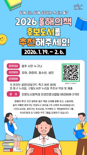 [뉴스다컴] 광주 동구는 한 해 동안 시민과 함께 읽을 2026년 ‘책 읽는 동구 올해의 책’ 선정을 위해 후보 도서 추천을 오는 2월 6일까지 접수한다고 밝혔다.