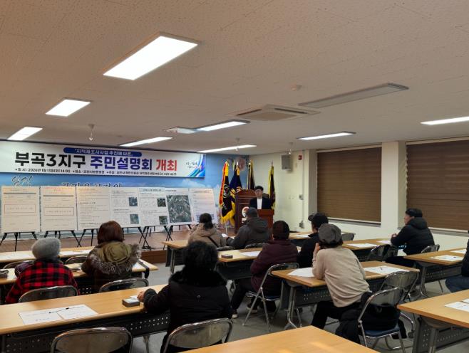[뉴스다컴] 김천시는 2026년 지적재조사사업 실시계획에 따른 사업지구 지정을 위하여 1월 13일 평화동 보훈회관에서 부곡3지구 토지소유자 및 이해관계인 등을 대상으로 주민설명회를 개최했다.