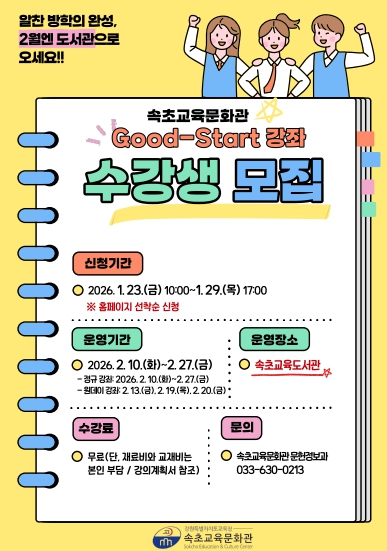 [뉴스다컴] 속초교육문화관(관장 이윤전)은 2월 10일부터 27까지 10일간 속초교육도서관에서 예비 초·중·고등학생, 초등 가족을 대상으로 ‘2026년 굿 스타트(Good-Start) 강좌’를 운영한다.