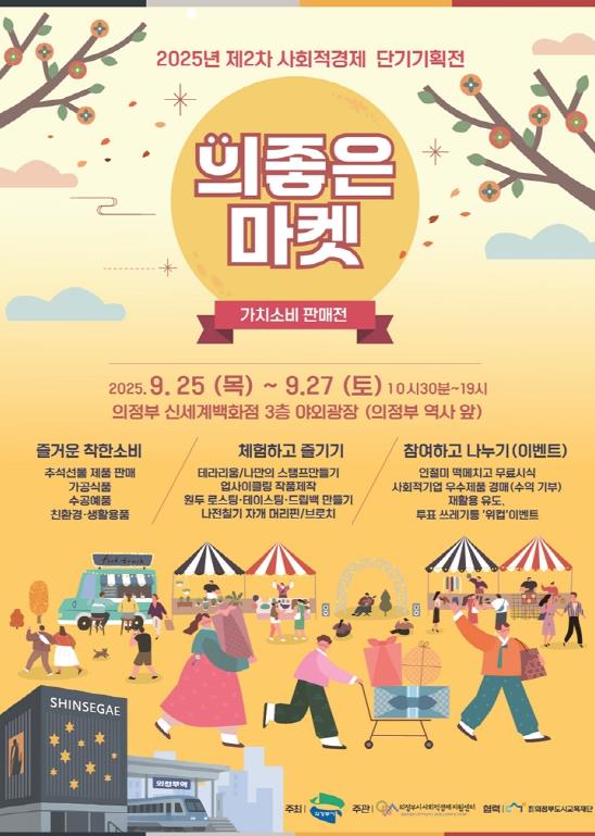 [뉴스다컴] 의정부시는 9월 25일부터 27일까지 3일간 신세계백화점 의정부점 야외광장 3층에서 2025년 제2차 사회적경제 단기기획전 ‘의좋은마켓’을 개최해 사회적경제기업의 판로 확대와 지역경제 활성화에 나선다.